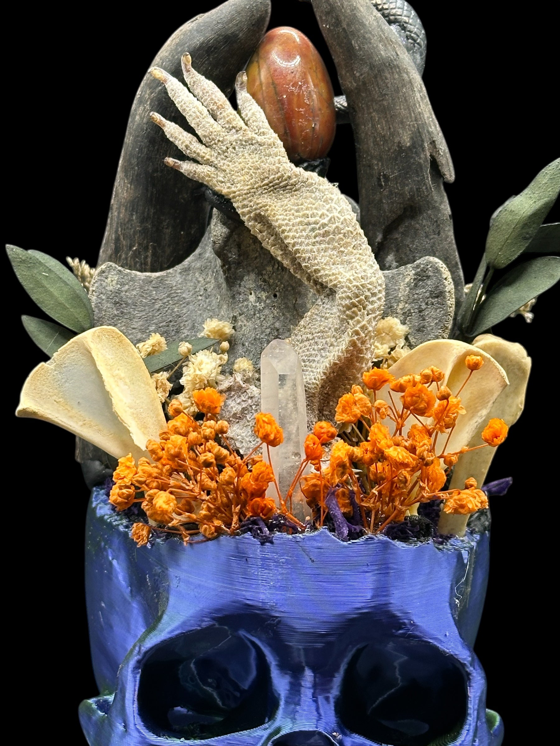 Blue 3D printed skull with an iridescent color tone. In this light weight skull sits two black goat horns and a unique blueish tone vertebra supporting a crystal egg-shaped stone. In the front is a dried arm from a Bearded Dragon (naturally died). In the back protrudes a black snake. The skull is also decorated with a quartz crystal, ulna bones and dried orange flowers.