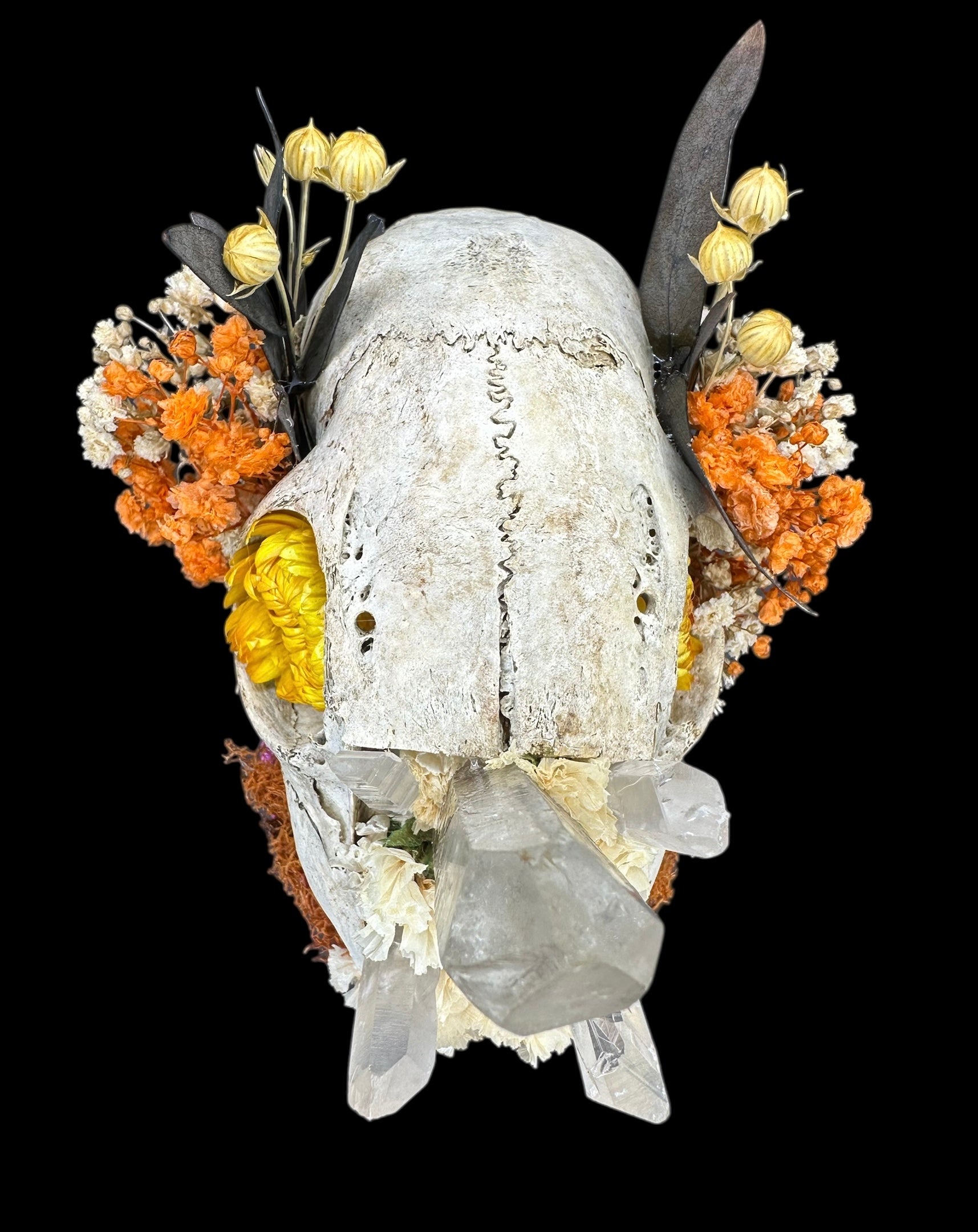 Creatively designed 3D printed skull with an iridescent color tone. In this light weight skull sits a real skull filled with quartz crystals. It is decorated with dried florals over orange moss. This is a unique and one-of-a-kind piece.
