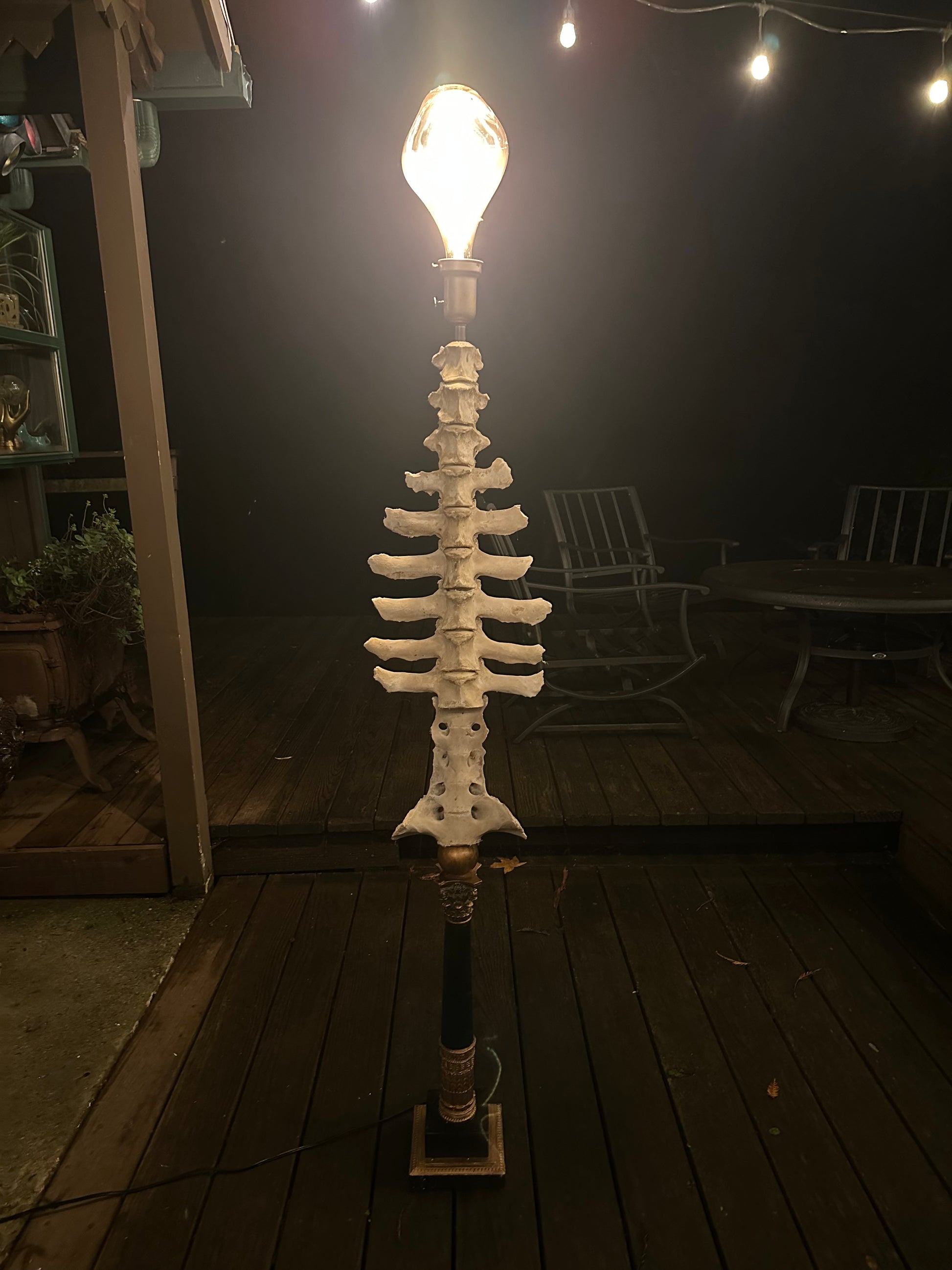 This gorgeous cow vertebrae lamp includes spine and sacrum. It is a beautiful statement piece that measures 5 ft. 11 inches tall with the light bulb. The vintage plaster base is hand painted black/gold and sealed with a clear coat.