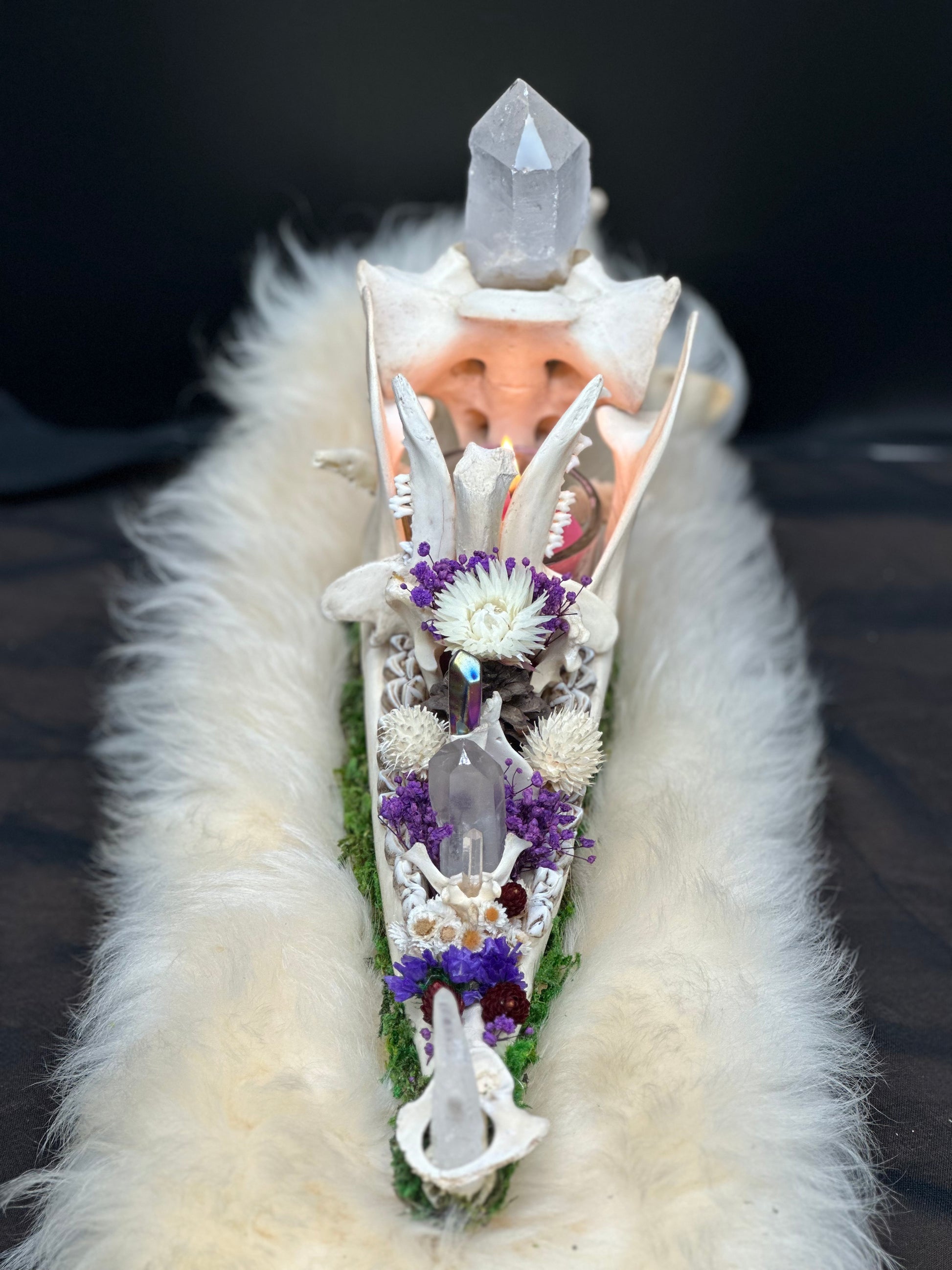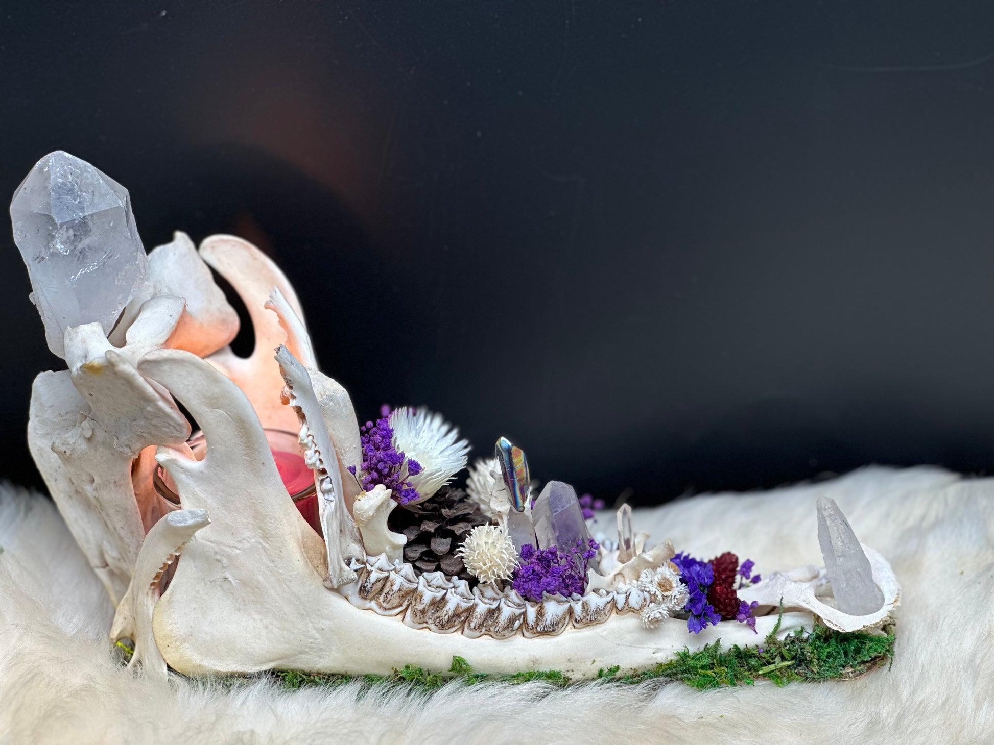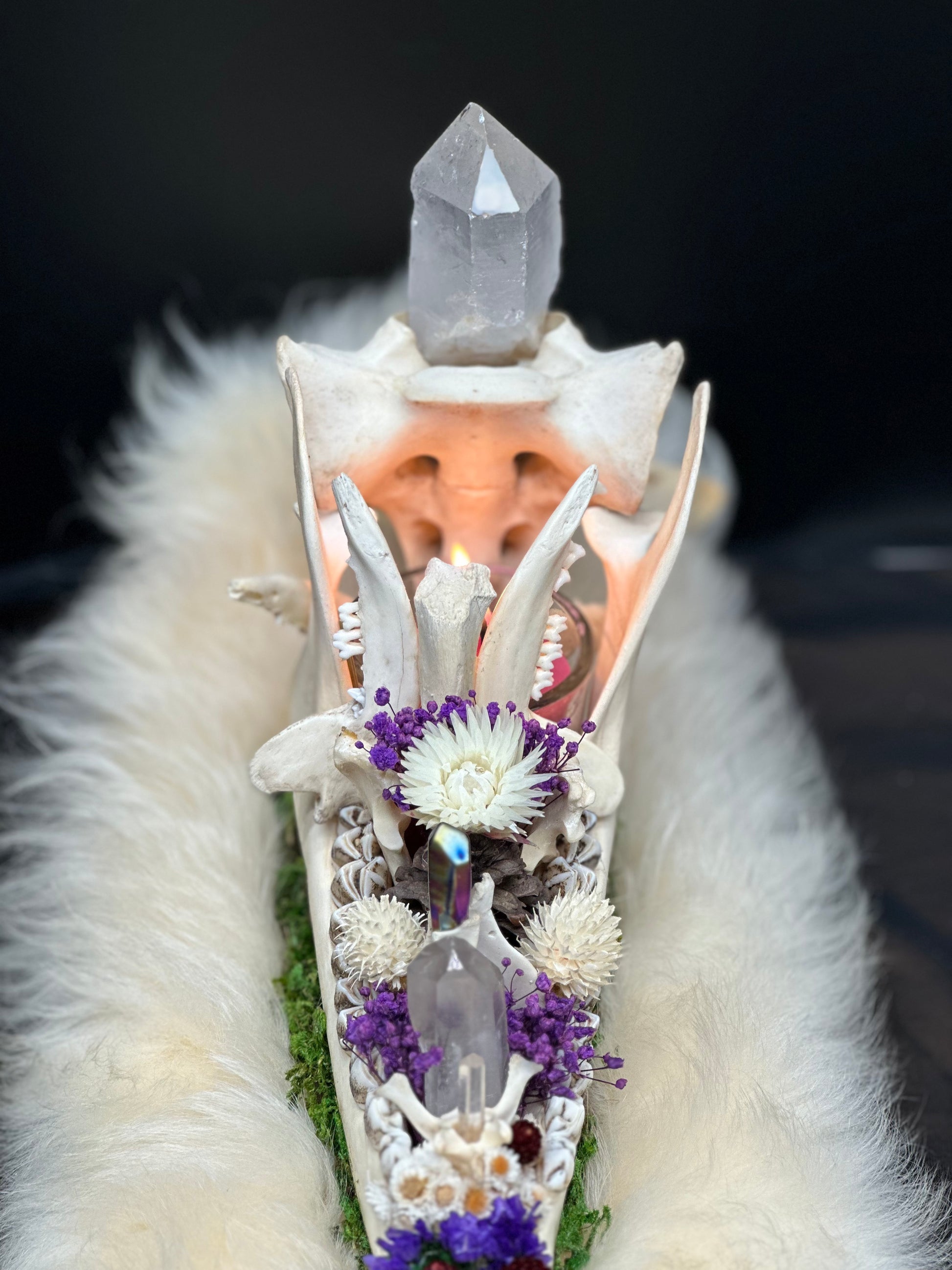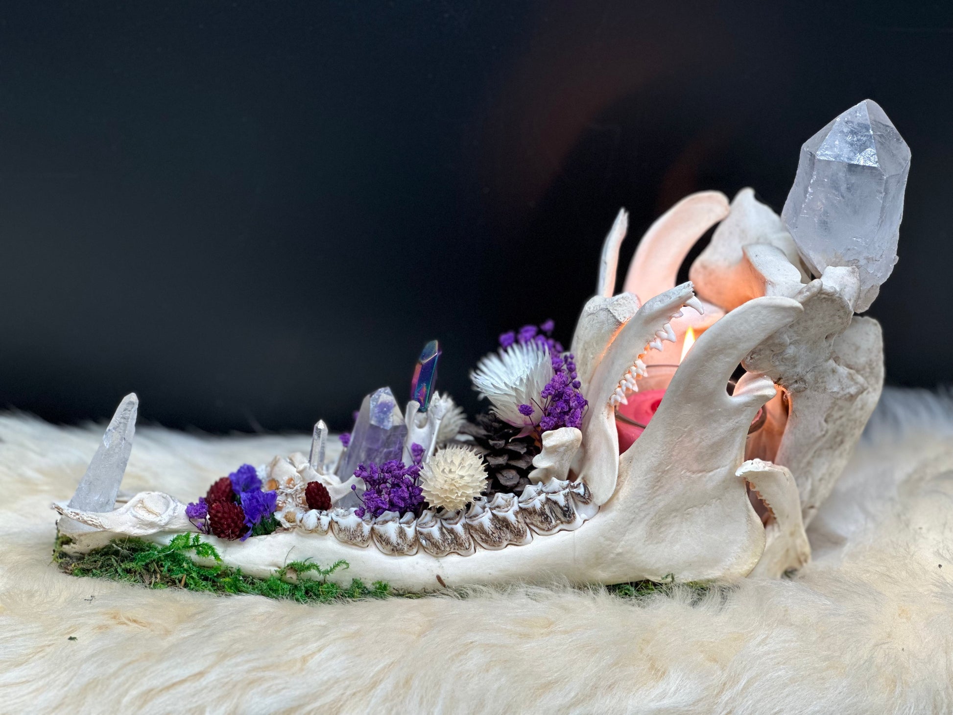 Beautiful candle holder made with an articulated deer jaw. It is decorated with moss, dried flowers, pine cone, 4 Brazilian quartz crystals, 1 aura quartz, and a variety of animal bones: a deer sacrum, opossum pelvic bone, 2 opossum ulnas, 1 fox vertebra, 4 jaw bones, and 1 opossum scapula.