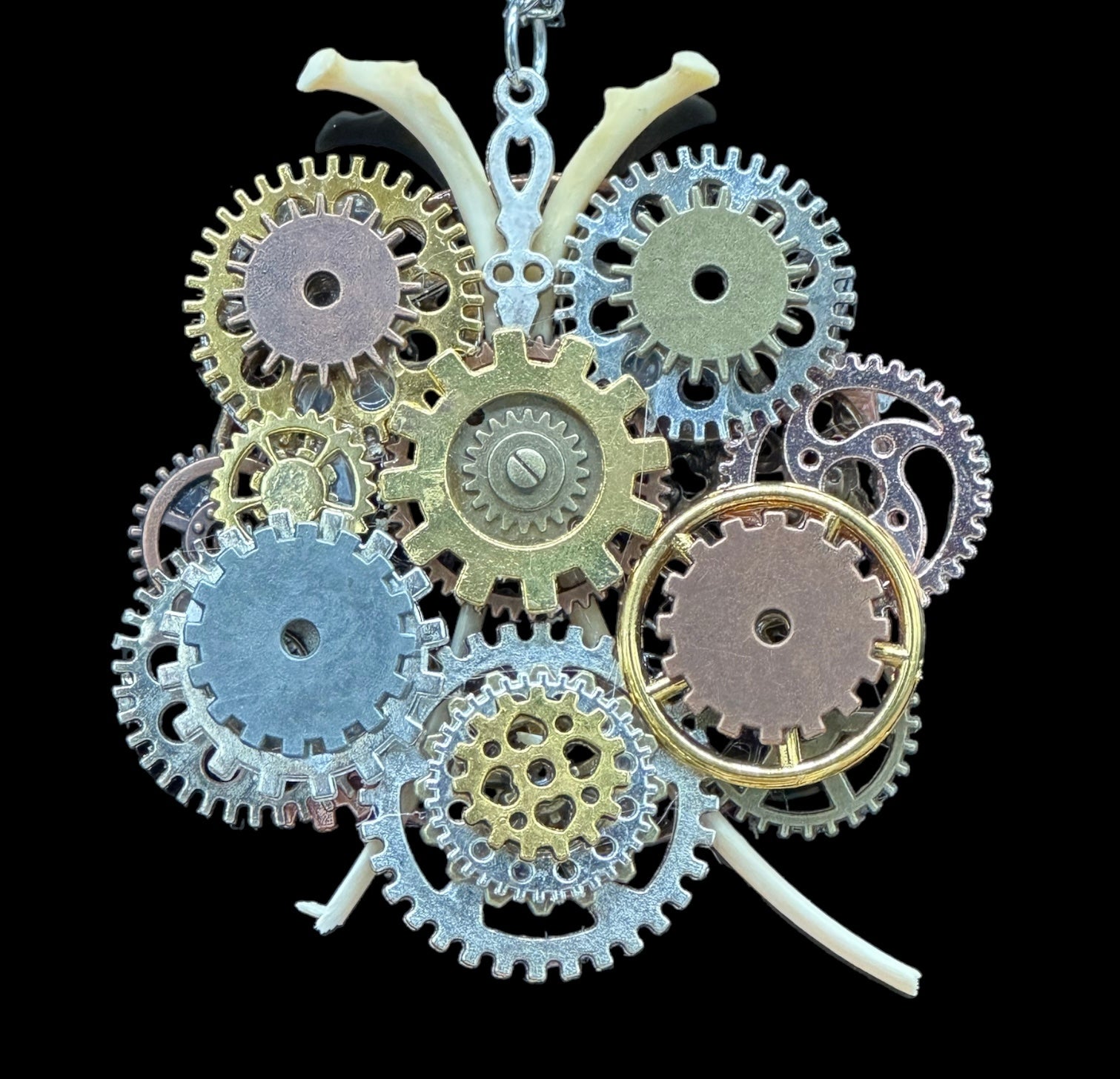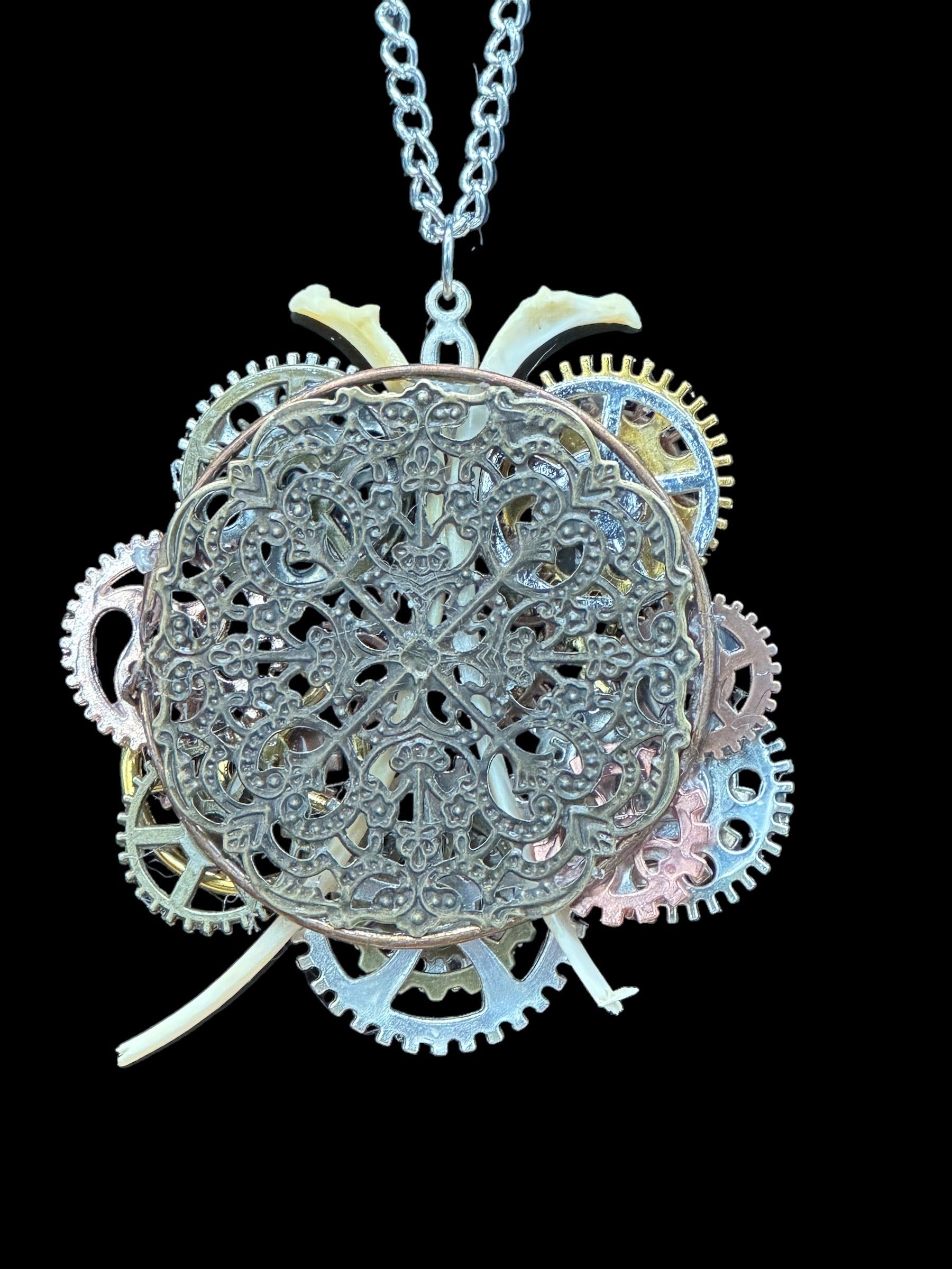 Original Steampunk inspired metal gear and fox bone necklace. The animal bones include two fox ribs.
