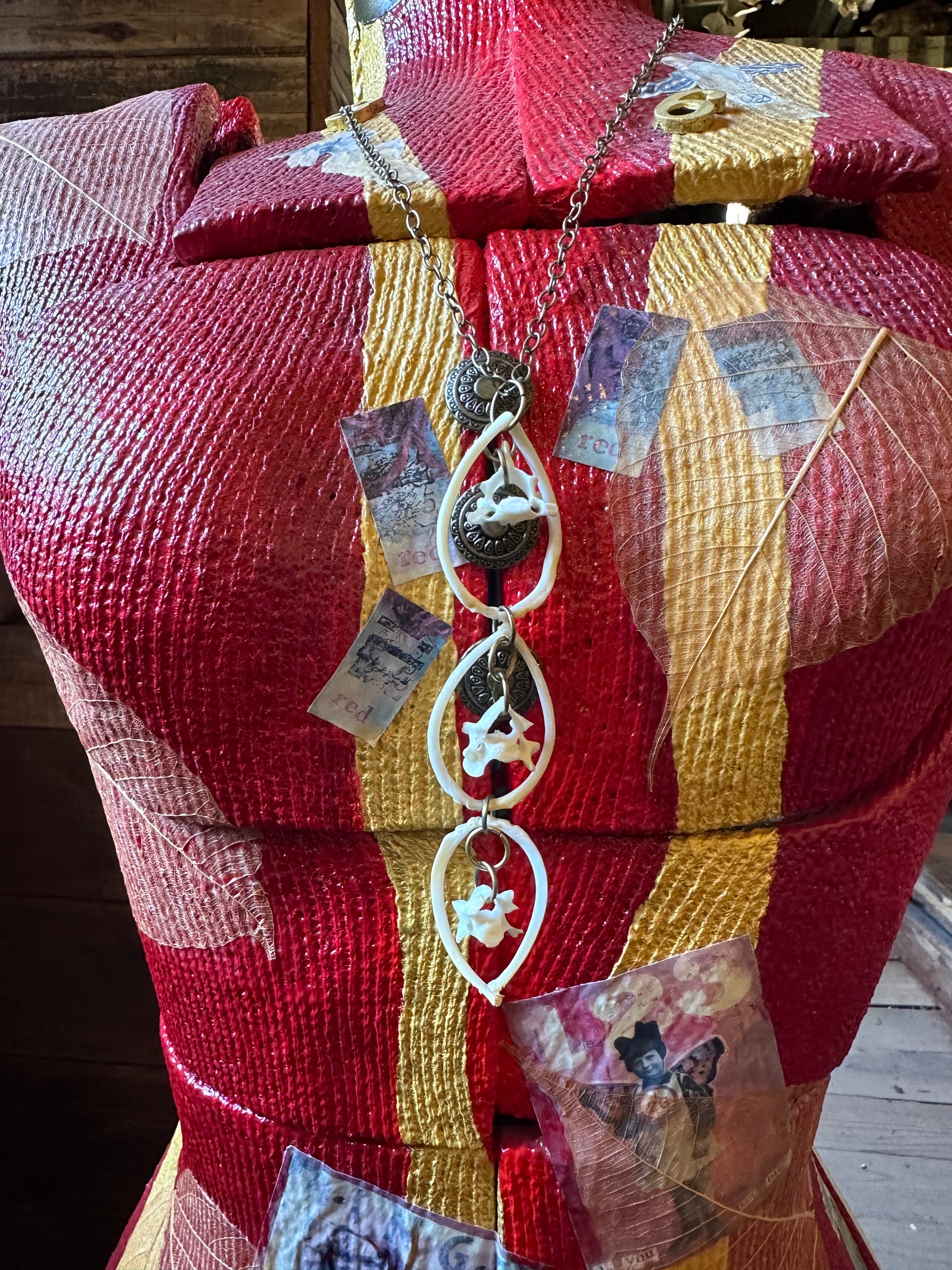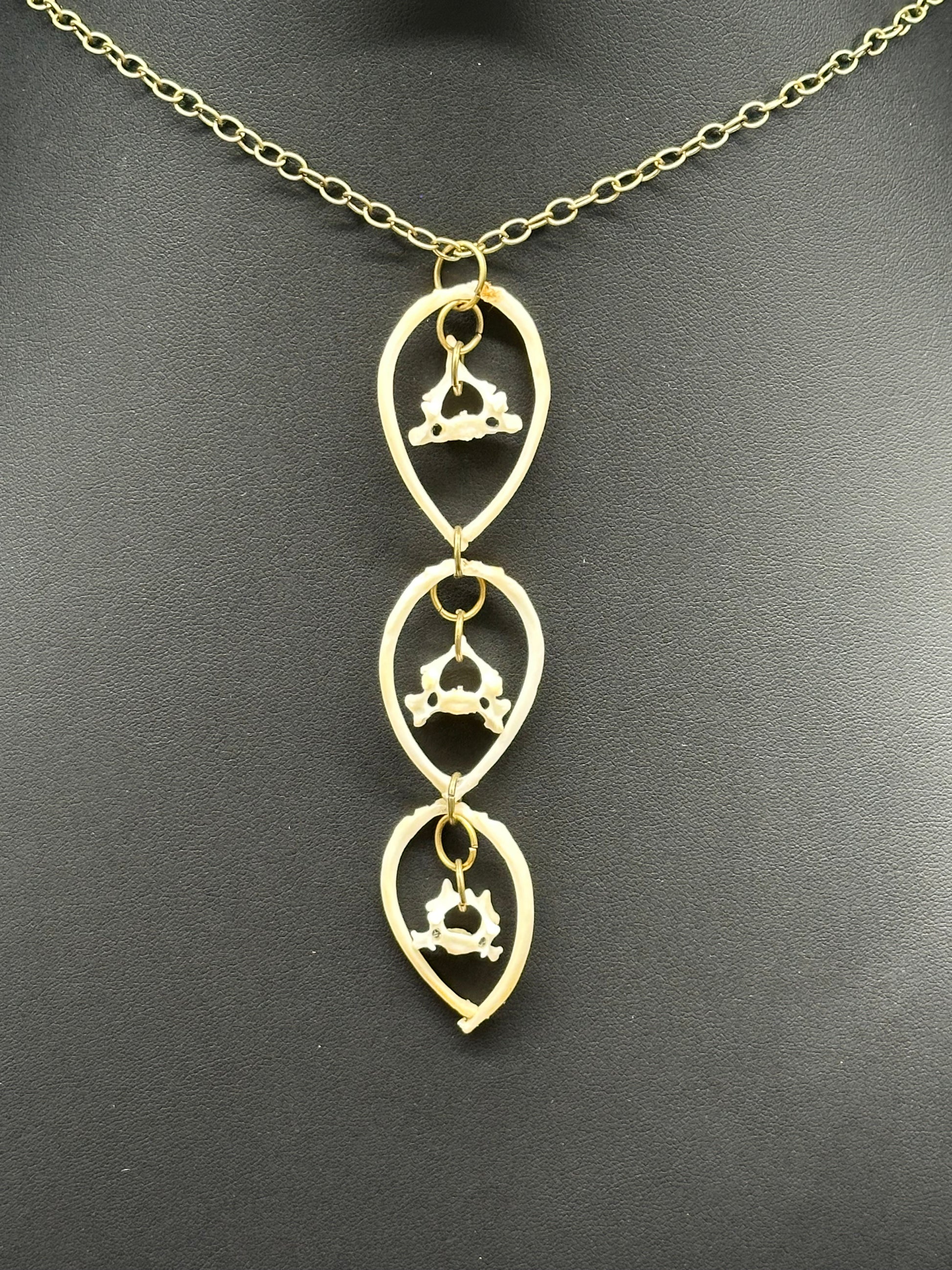 Three trier necklace with six skunk ribs and three vertebrae. The pendant measures 4.5 inches. The total length with the brass-plated chain measures 17 inches.